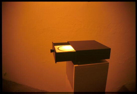 Closer view of a single unit showing internal light source illuminating parchment under glass within the drawer. Inscription on the parchment shows an "X" marking a place within the confines of a circle.